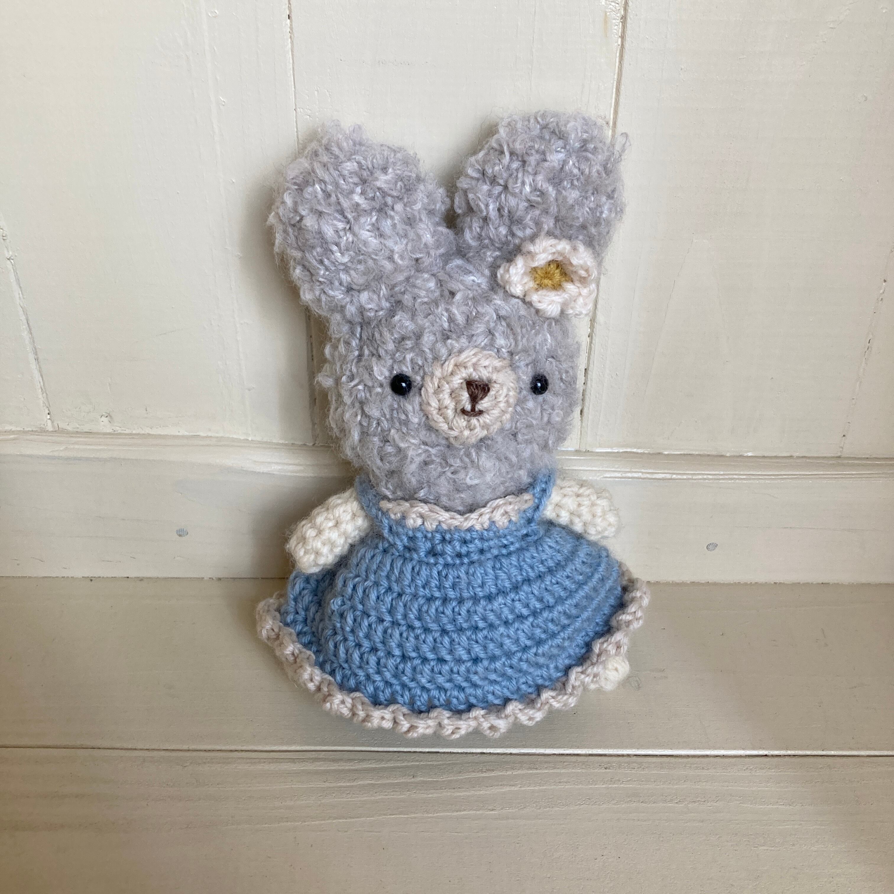 かぎ針編みで丁寧に編み上げたうさぎちゃんは、ふわふわもこもこで思わず抱きしめたくなるかわいさです。