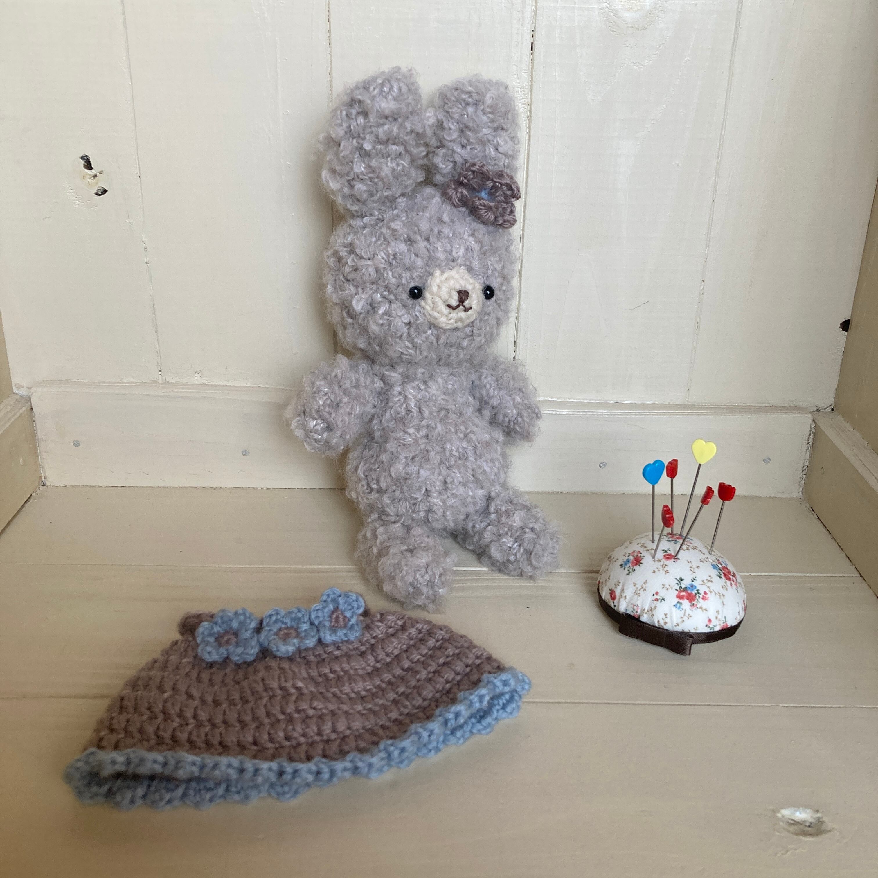 毛糸のワンピースには小さなお花がついて、お耳にも毛糸のお花の飾りを添えています。